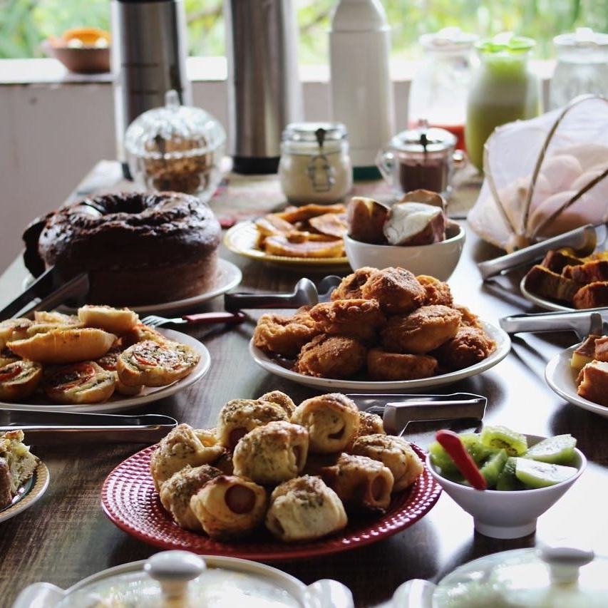 O café da manhã simples tem tudo para garantir a energia necessária para subir e descer nas trilhas. Torrada, pães, frios, tomate com manjericão, bolos, frutas, sucos e geleias naturais da região.