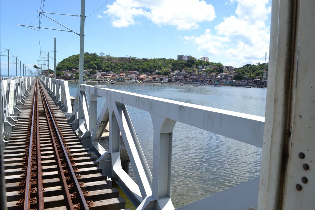 O trem cruza uma ponte de ferro, sobre a Península de Itapagipe. Numa época não muito distante, coisa de 20 anos, essa área era tomada de palafitas.